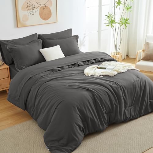 HIMEET Full Size Comforter Sets - 7 Pieces Dark Grey Bed in a Bag, Soft Lightweight Bedding Set, All Season Bed Set with Comforter, Flat Sheet, Fitted Sheet, Pillowcases & Pillow Shams