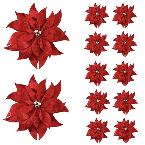 BUVANE 12PCS Christmas Velvet Poinsettia Flowers 10'' Double Layer Christmas Artificial Flowers Ornaments for Xmas Tree Wreaths Garland Holiday Decoration (12, Double Layer)
