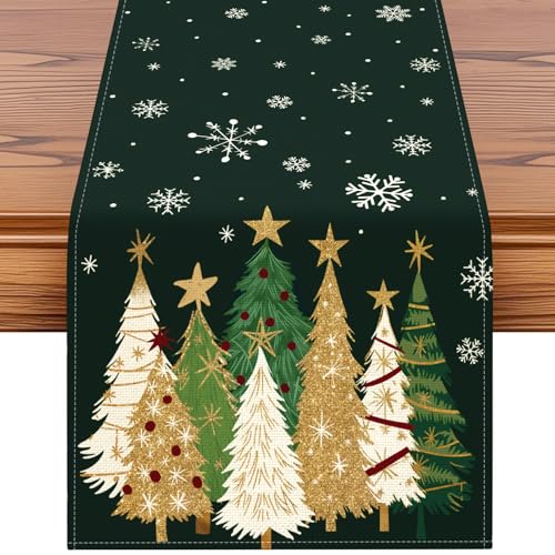 OTOSTAR Snowflakes and Christmas Tree Table Runner, Xmas Seasonal Winter Holiday Kitchen Dining Table Decoration for Home Party Decor 13x60 Inch (Green)