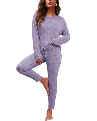 difficort Pajamas for Women Set Ribbed Knit Pjs 2 Piece Lounge Sets Long Sleeve Sleepwear Loungewear,K-Purple,XX-Large