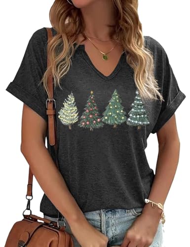 Women's Christmas Tree V Neck Shirt Funny Xmas Green Tree Graphic Short Sleeve Tee Family Matching Holiday Winter Tops(M,R-Grey-4)
