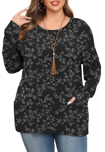 Lastshe Plus Size Fall Winter Blouses for Women Dressy Casual Floral Prints Daily Long Sleeves Tunic Clothes Wear with Pockets,Black B FL,3X
