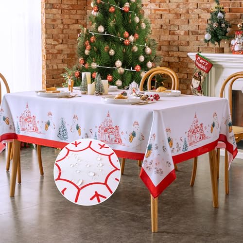 VidaFete Christmas Rectangle Tablecloth, Snowman Pine Tree Snowflake Pattern White Polyester Table Cloth, Waterproof Wipe Clean Holiday Table Cover for Xmas Dining Parties Home Decoration,60x102in