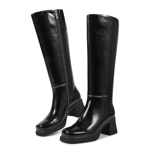 ISNOM Black Knee High Boots Women Chunky Heel Platform Boots Square Toe Tall Zipper Black Boot Women for Party Night Out Walking Vaction Size 8
