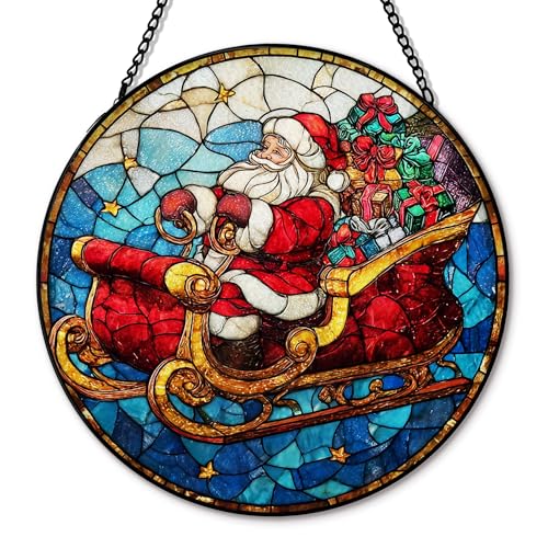 Hxlac Santa Christmas Suncatcher Stained Glass Garden Window Hanging, Winter Santa Sleigh Xmas Sun Catchers Indoor Window Glass Round Wall Decor, Christmas Wall Art Hanging Decorations, 7.8"x7.8"