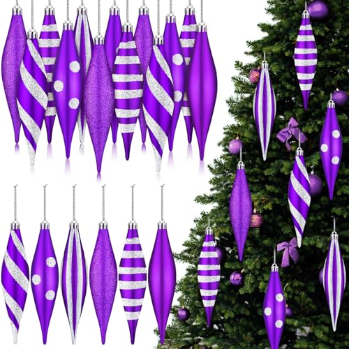 Hungdao 12 Pcs Purple and Silver Christmas Ornaments 6.3 Inch Droplet Stripe Dot Hanging Christmas Ornaments for Xmas Tree Decor for Home and Holiday Party Xmas Trees Accessories