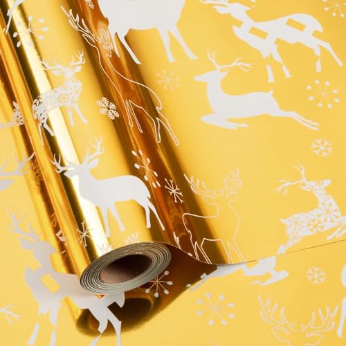 Merture Reindeer Christmas Wrapping Paper Roll Metallic Yellow Solid Color Gift Wrap for Christmas, Wedding, Birthday, Valentines Day, Mothers Day, Baby Shower - Mini Roll - 17 In X 32.8 Ft(46.5 sqft)
