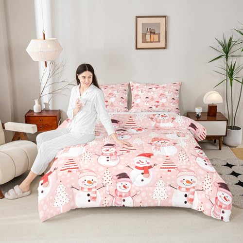 Manfei Christmas Comforter Set King Size, Snowman and Xmas Trees Down Comforter with 2 Pillowcases, New Year Pink Bedding Set 3pcs for Kids Girls Adults Bedroom Decor Lightweight Duvet Insert