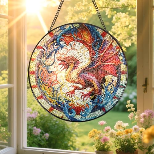 LIRAVENO Stained Glass Window Hanging - Dragon Sun Catchers Indoor Art Decor Outdoor Garden Decoration with Hooks and Chain Home Wall Ornament Birthday for Men Women Lover Mom
