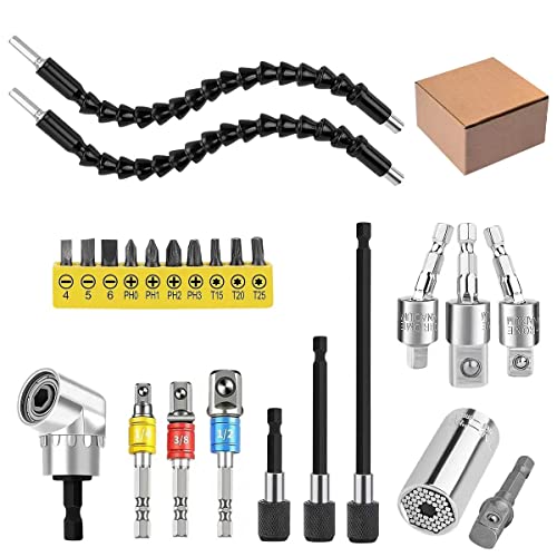 24pcs Flexible Drill Bit Extension Set, 105°Right Angle Drill Attachmen, Rotatable Joint Socket 1/4 3/8 1/2 Inch Hex Socket Adapter Socket Bendable Drill Bit Extension Screwdriver with a Box (Sliver)