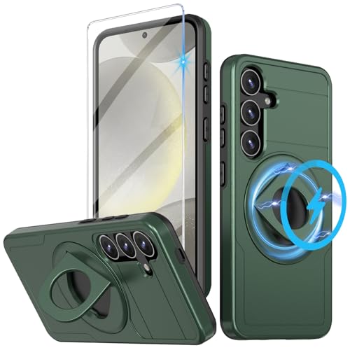 for Samsung Galaxy S24 Mag-Safe Kickstand Case with Screen Protector,Slim Shockproof Military Heavy Duty Anti-Drop Full Body Protection,360 Rotating Stand Magnetic Phone Case (blackish green)
