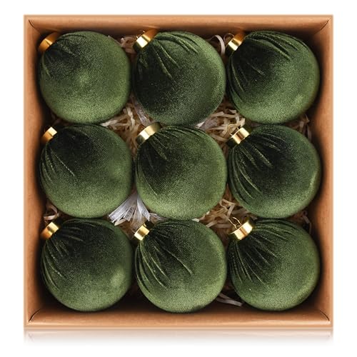 Velvet Ornaments for Christmas Tree Decorations - Moss Green Xmas Ball Ornament for Indoor Holiday Decor - Shatterproof Christmas Bulbs Ornaments 80mm 3.15inch - Pack of 9