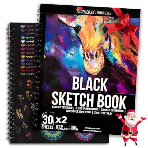 Black Sketchbook (Pack of 2, 60 Sheets) 9X12” - Heavyweight Paper 150GSM / 100 lbs, Perfect for Graphite & Colored Pencils, Charcoal, Chalk, Pack of 2 x Professional Black Drawing Paper ZENACOLOR