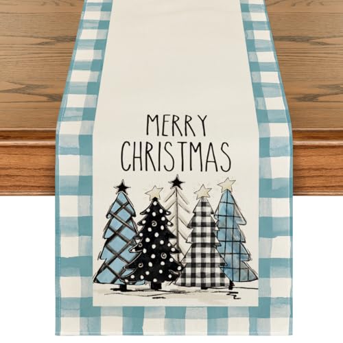 Artoid Mode Bule Watercolor Buffalo Plaid Christmas Trees Merry Xmas Table Runner, Seasonal Winter Holiday Kitchen Dining Table Decoration for Indoor Outdoor Home Party Decor 13 x 108 Inch