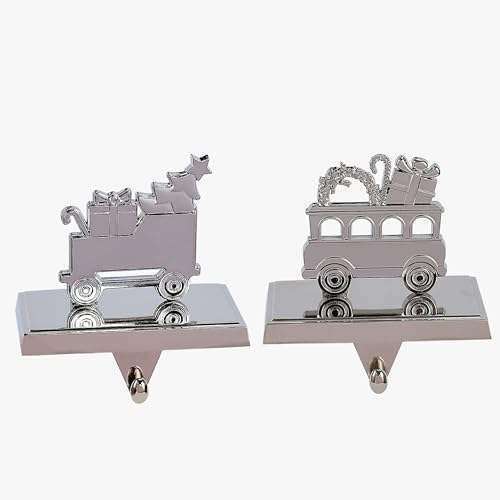 Amooca Christmas Stocking Holders Non-Slip Metal Hooks Fireplace Mantle Stocking Hanger for Christmas Party Decorations (Deer Train_02 Silver, 2 Pack)