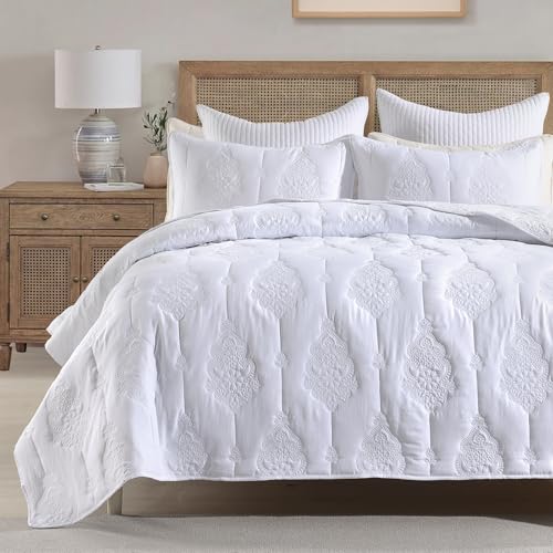 HORIMOTE HOME White Quilt King Size Floral Quilt Bedspread Lightweight Soft Pre-Washed Microfiber Bedcover, 3 Pieces Thin Comforter Bed Cover Bedding Set for All Season