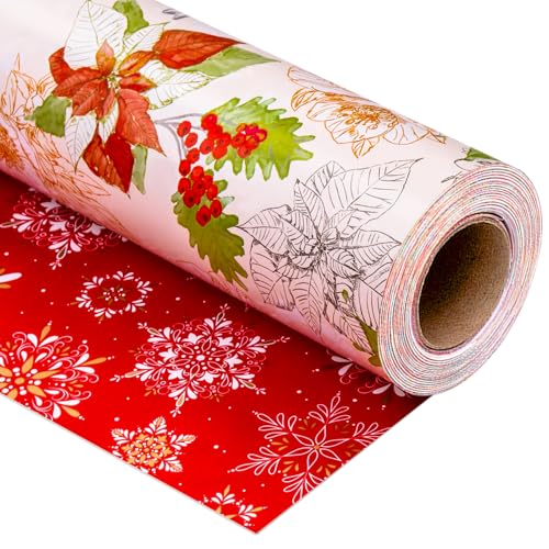 MAYPLUSS Christmas Wrapping Paper Roll, Vintage Reversible Christmas Gift Wrap with Poinsettia Design, Watercolor Red Green Floral Gift Wrapping Paper Holiday Present Packaging (17 Inch X 33 Feet)