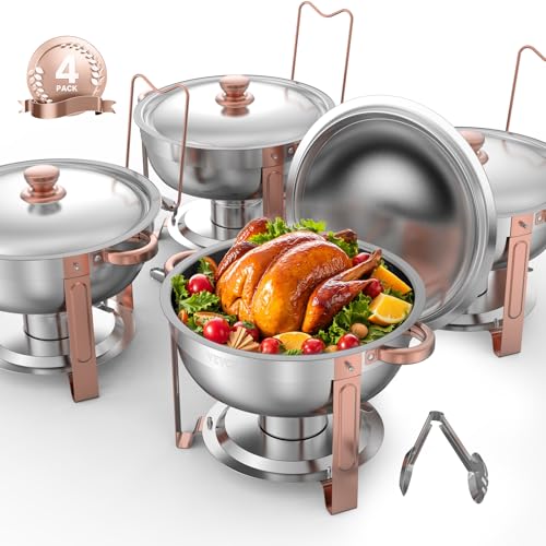 VEVOR Chafing Dish Buffet Set, 5 Qt 4 Pack, Stainless Steel Chafer with 4 Full Size Pans, Round Catering Warmer Server with Lid Water Pan Folding Stand Clip, for Weddings Parties Banquets, Rose Gold