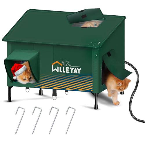 Extra Large Size Heated Cat House for Outside Winter,Weatherproof Outdoor Cat Shelter with Safe Escape Door and Roof Window, Insulated & Elevated Warm Cat Shelter for Feral Cat Multiple Stray Kitty