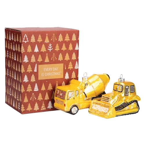 Every Day is Christmas Glass Blown Ornaments Cute Hand Made Figurines Tree Decoration, Set of 2 pcs Bulldozer Concrete Truck