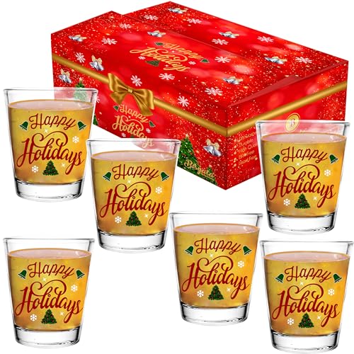Bisyata christmas Shot Glass Gift Set -Happy Holidays- Glasses Drinkware or Votive Candle Holder for Thanksgiving or christmas Table Decoration - 2oz Set of 6 - With Gift Box