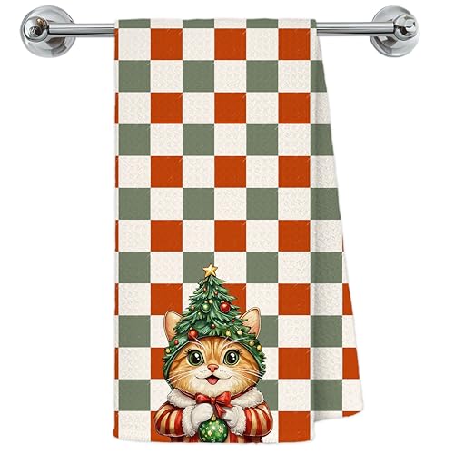 Exqcom Christmas Orange Tabby Cat Kitchen Towels, Cat Lover Mom Lady Gifts Dish Tea Towels for Kitchen Decor, Red and Green Plaid Christmas Tree Kitten Hand Towel for Bathroom Decor, 16x24 Inch