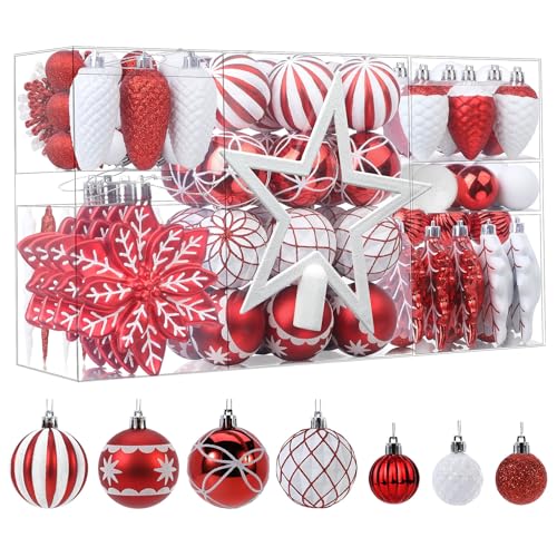 SHareconn 106PCS Christmas Balls Ornaments Set, Colorful Shatterproof Plastic Decorative Baubles for Xmas Tree Decor Holiday Wedding Party Decoration with Hanging Hooks, Red & White