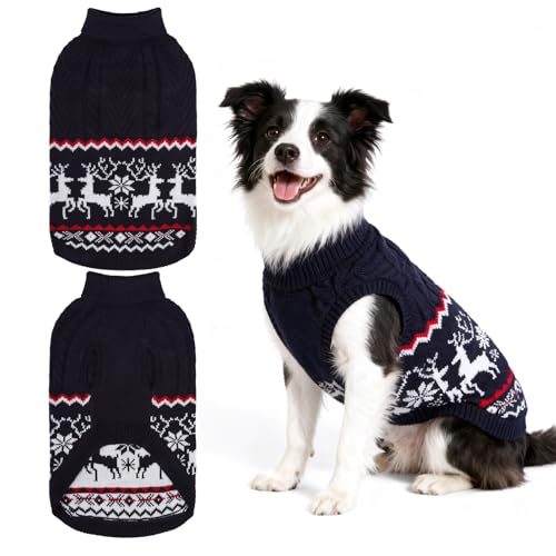 BINGPET Christmas Dog Sweater for Medium Dogs,Classic Reindeer Knitwear Xmas Dog Clothes Holiday Outfit,Soft Warm Winter Pet Puppy Cat Sweaters Coats with Leash Hole Indoor Outdoor Walking(Navy,ML)