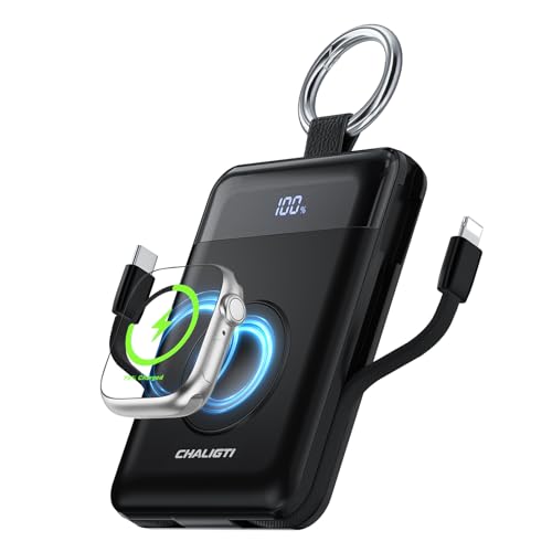 CHALIGTI Portable Charger,5000mAh PD 20W Super Fast Charging Power Bank with Built-in Cables,Travel Keychain Battery Pack for Apple Watch Ultra/11/10/9/8/7/6/SE,iPhone 17/16/15/14/13/12 (Black)