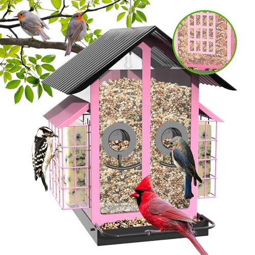 FlowaFoli Bird Feeders for Outdoors, Metal Bird Feeder with Double Suet Cage Weatherproof Metal Roof, 2 in 1 Mixed Seeds Suet Feeder, 4Lbs Large Capacity, Great for Finch、Cardinal、Chickadee(Pink)
