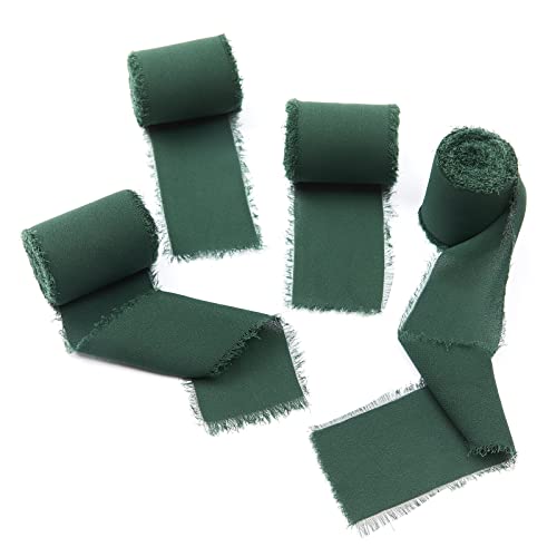 4 Rolls Dark Green Handmade Fringe Chiffon Silk Ribbon 2" W x 5Yd Per Roll,Frayed Edges Ribbon Set for Gifts Wrapping,Wedding Invitations,Bouquets,DIY Crafts (2" x20Yd, Dark Green)