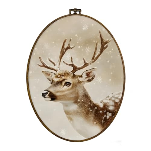dvhdajed Vintage Christmas Deer Oval Wall Art Decor, Farmhouse Winter Deer Framed Canvas Art, Retro Rustic Reindeer Holiday Oval Wall Hanging Decor for Gallery Bedroom Kitchen, 8.7x11.3 Inch
