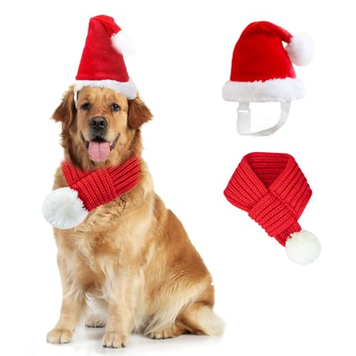 ANIAC Dog Santa Hat with Scarf Kids Xmas Cap Doggy Christmas Costume Pet Warm Headgear and Neck Accessories for Medium Big Dogs and Kids (Large)