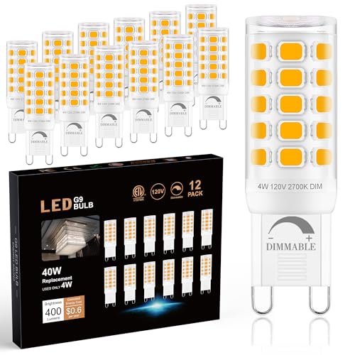 Sailstar G9 LED Bulb Dimmable 2700K Soft Warm White 12 Pack, T4 G9 4W Replacement for 40 Watts Halogen, Ceramic Bi Pin Base, 120V 400 Lumen 360°Beam Angle, G9 Light Bulbs for Chandelier
