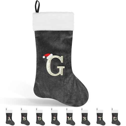 Glimin 22 Inches Monogram Christmas Stocking with Letter Soft Velvet with White Plush Cuff Embroidered Initial Xmas Stockings for Christmas Holiday Fireplace Decoration Gifts (G Letter, Gray)