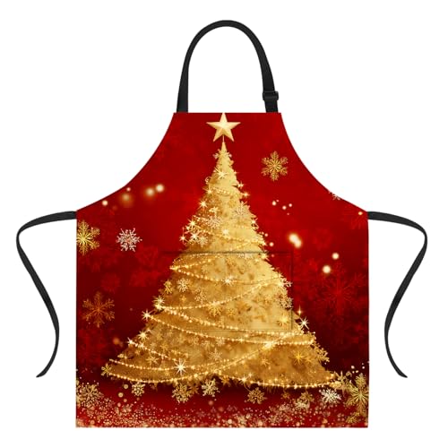 ANNA QUEEN Merry Christmas Apron for Women Men with Pockets Golden Christmas Tree Apron Adjustable Kitchen Chef Cooking Apron