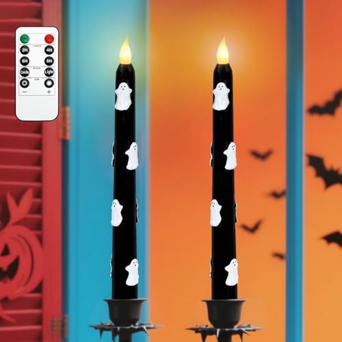 Halloween Flameless Taper Candles with Remote & Timer, Embossed Ghost LED Taper Candles for Home Party Haunted House Gothic Halloween Decorations, Set of 2, Black