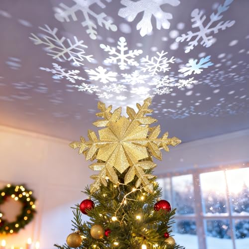 DG-Direct Christmas Tree Topper Lighted with Golden Snowflake Projector, Led Rotating Magic Snowflake, 3D Hollow Glitter Lighted Gold Snow Tree Topper for Christmas Tree Decorations