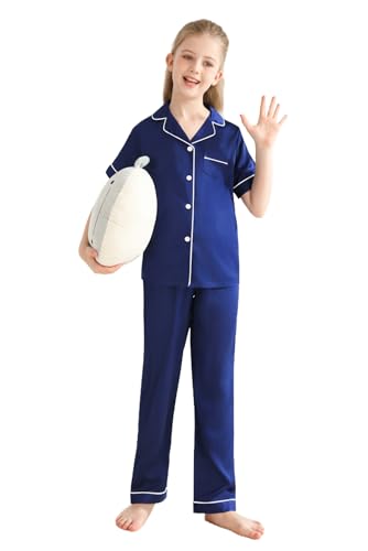 Veseacky Pijamas Para Niñas Girls Silk Pajamas Short Sleeve Pjs for Kids Satin Lounge Sets Sleepwear with Long Pants (Blue,6y 7y)