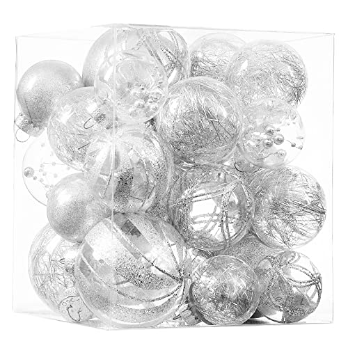 Clear Christmas Ball Ornaments,24ct Shatterproof Plastic Decorative Christmas Ornaments Hanging Xmas Tree Baubles Set with Stuffed Delicate Glittering Decorations for Holiday Party Home Decor (Silver)