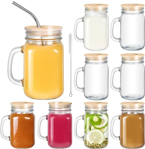 DESIYUE 9 Pack 16 Oz Mason Jar cups with Bamboo Lid and Straw, Mason Jar Drinking Glasses,Wide Mouth Ice Coffee Mugs with Handle for Juice, Smoothies, Kombucha, Tea, Milk,Drinking Storage Containers