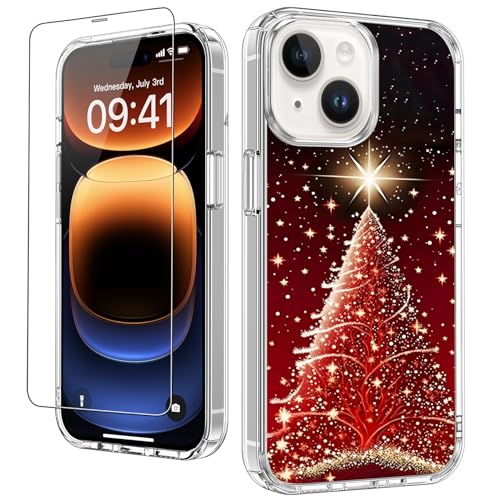 LUHOURI Christmas Phone Case for iPhone 14 with Screen Protector - Wireless Charging - Fashionable Pattern Design - Slim Shockproof Crystal Acrylic Clear for Women Girls, Magical Christmas Tree