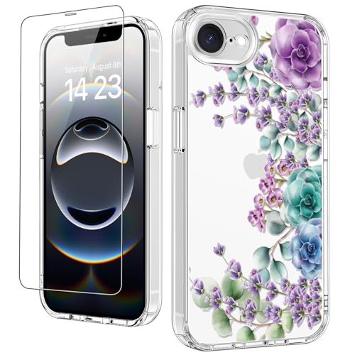 LUHOURI for iPhone 16e Case with Screen Protector - Crystal Acrylic Clear - Fashionable Pattern Design - Wireless Charging - Slim Fit Protective Phone Cover for Women Girls,Colorful Succulents