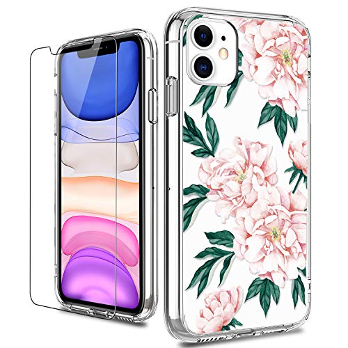 LUHOURI Designed for iPhone 11 Case with Screen Protector - Crystal Acrylic Clear for Women and Girls - Slim Fit Protective Phone Cover 6.1" - Blooming Floral Flower