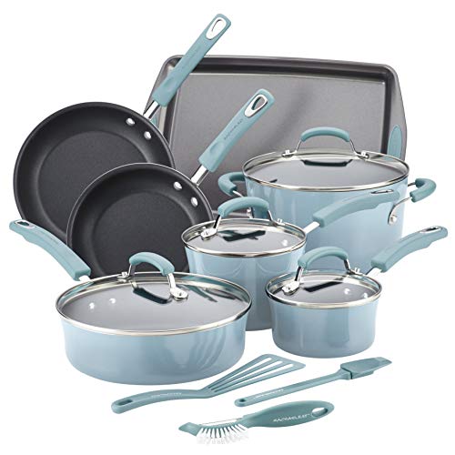 Rachael Ray Brights Nonstick Pots and Pans, Includes Crispy Sheet Baking Pan/Bakeware and Kitchen Cooking Tools, 14 Piece Cookware Set - Sky Blue