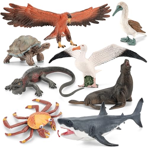 THINKBAY 8PCS Large Galapagos Island Animal Figurines Set, Realistic Giant Tortoise Sea Animal Toys Includes Shark, Hawk, Crab, Sea Lion, Blue-Footed Booby, Educational Toys for Toddlers Kids