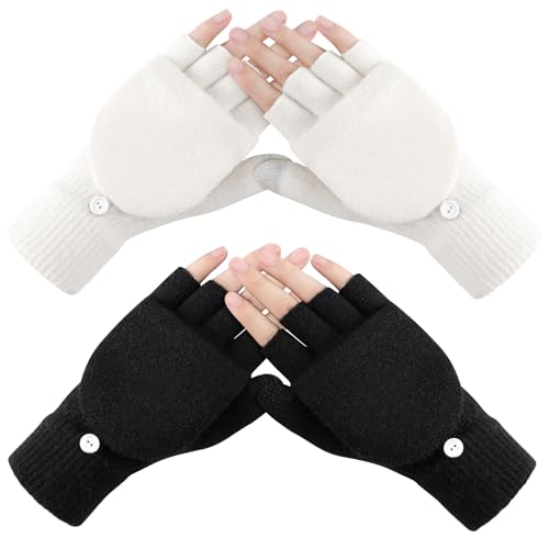 Premillow Winter Fingerless Gloves for Women, Warm Half Finger Knit Winter Gloves Women, Typing Womens Glove Mittens with Flap Cover, 2 Pairs Convertible Womens Fingerless Gloves, Black, White