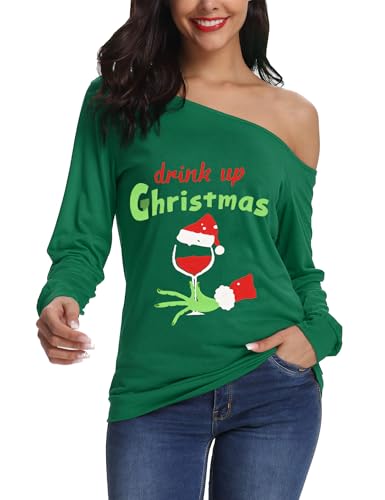 LYHNMW Women's Sexy Off Shoulder Long Sleeve Christmas Letter Print T-Shirt Tunic Tops Cute Funny Xmas Tee Tops Blouse