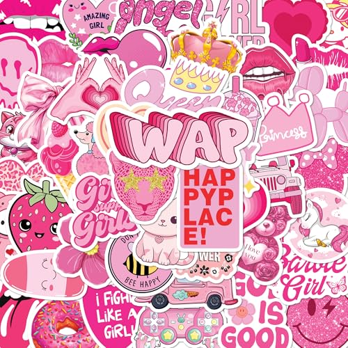 BEATRI Preppy Pink Vinyl Sticker 50Pcs Party Supplies Vinyl Waterproof Aesthetic Pinky Stickers Decor for Laptop Water Bottle & Travel Gear | Non-Repeating Decals, High-Definition Print