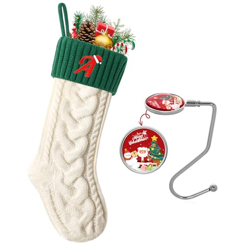 Ulico 18’’ Large Christmas Stockings with Initials, Embroidered Monogram Knit Letter Stocking,Xmas Stocking for Kids, Holiday and Family Stocking for Fireplace or Party Decoration,White Green A